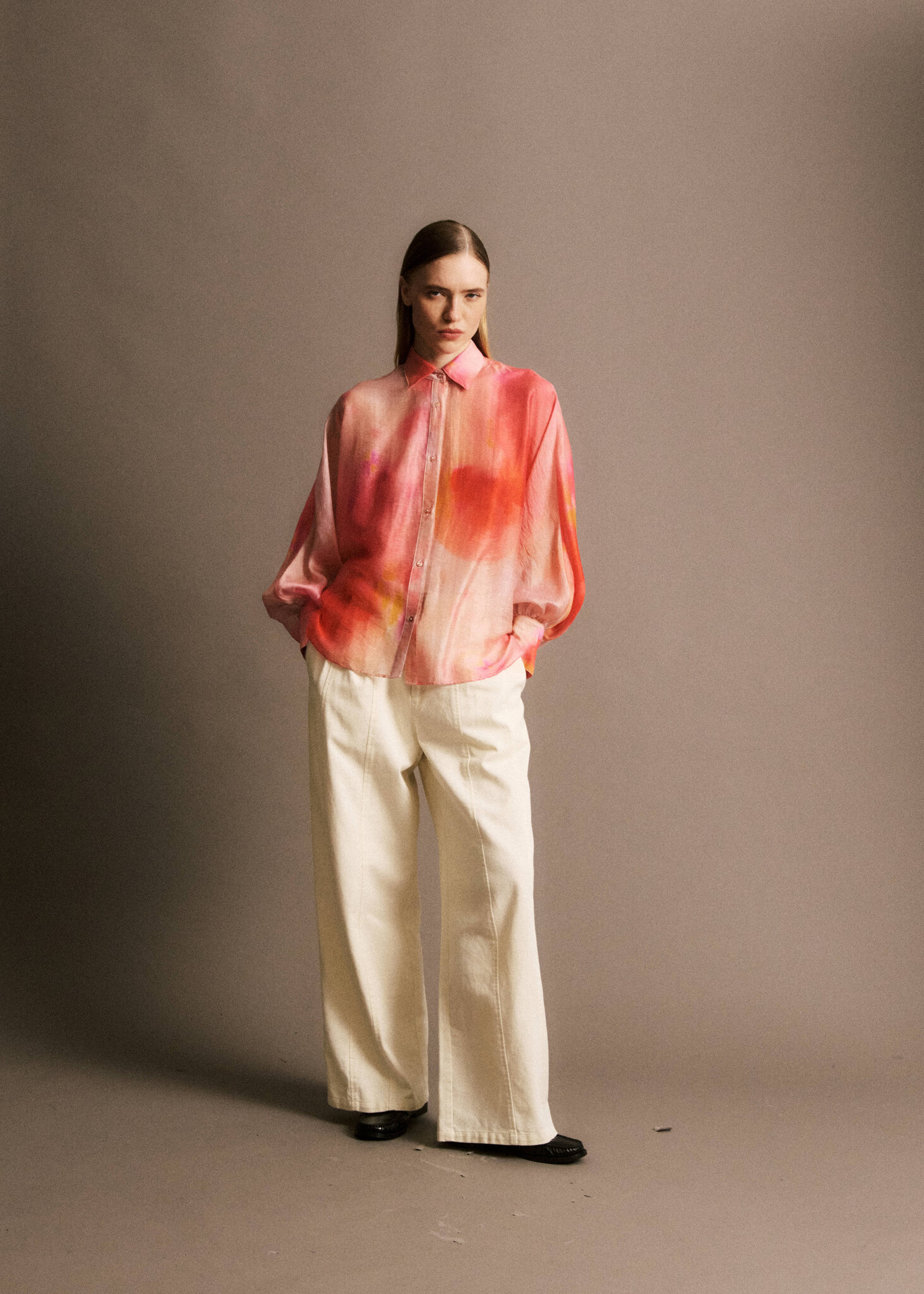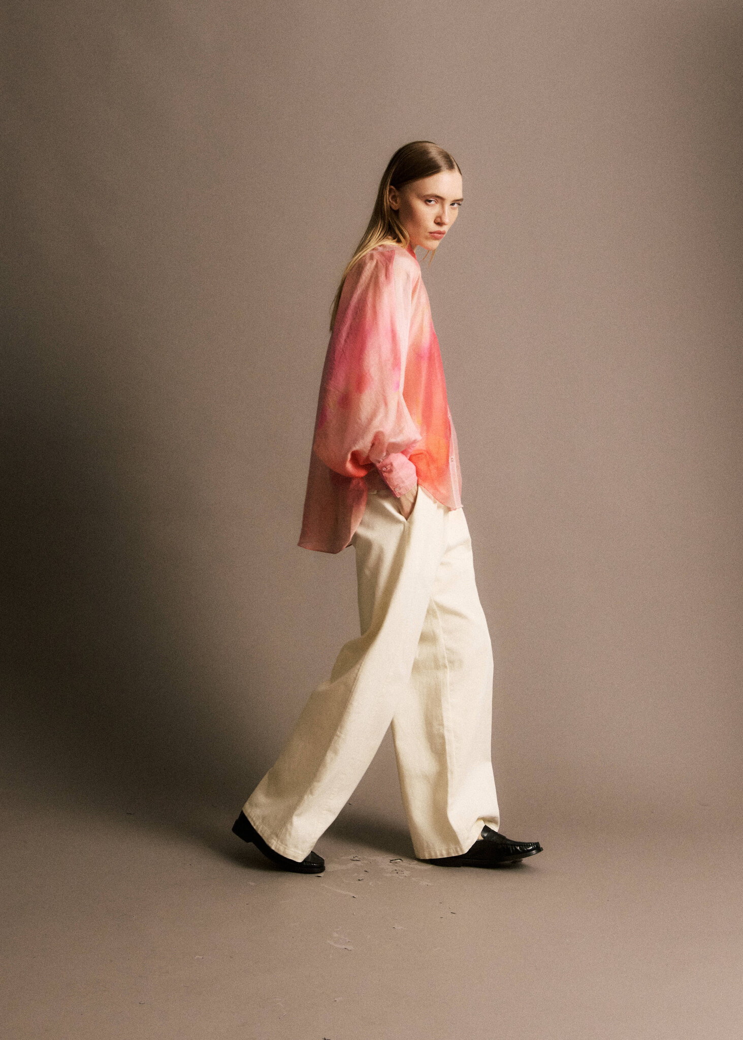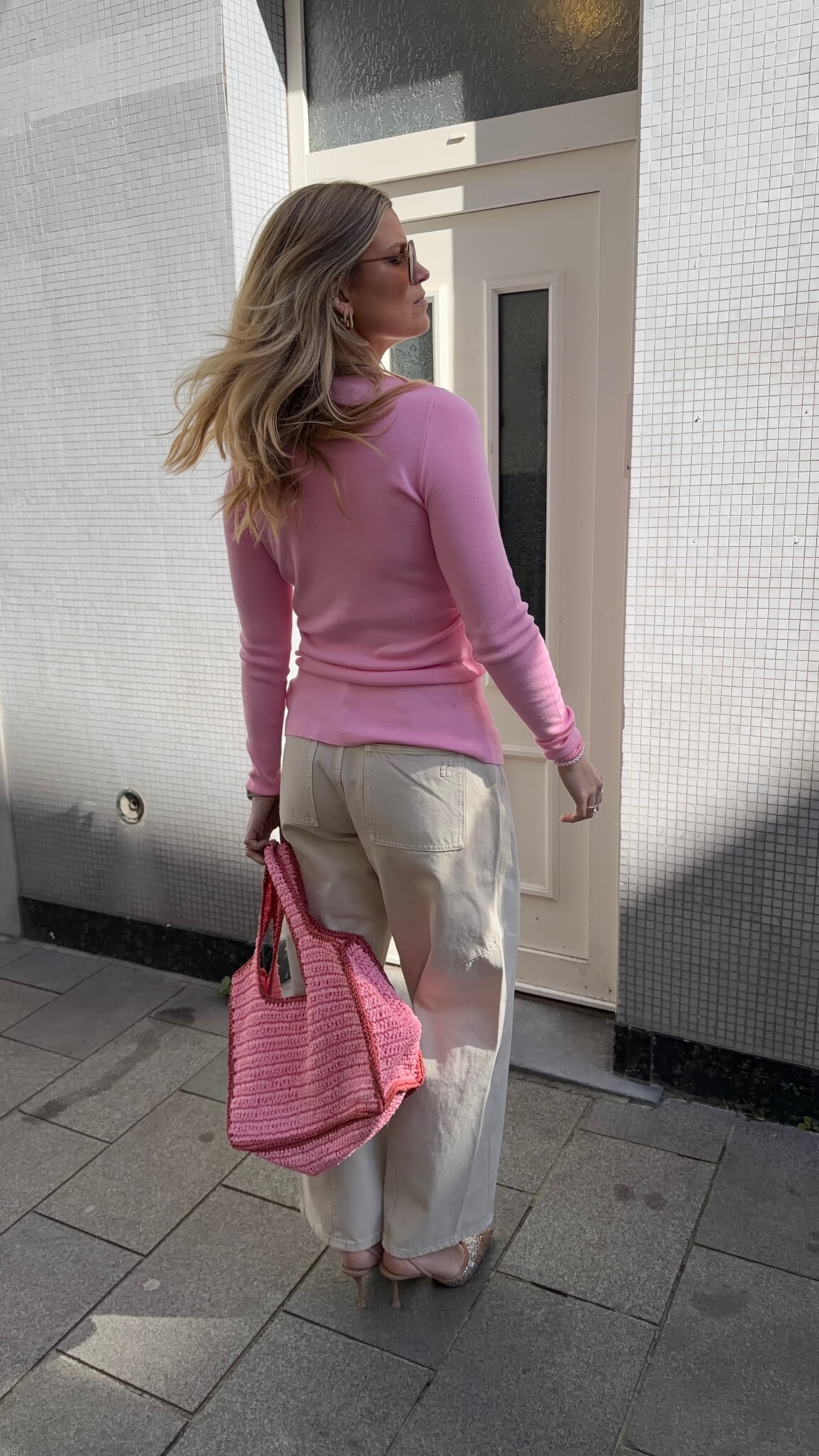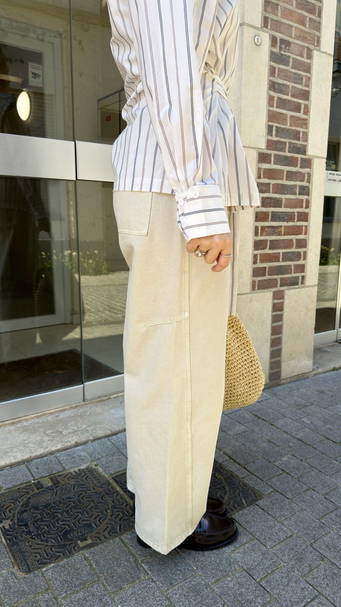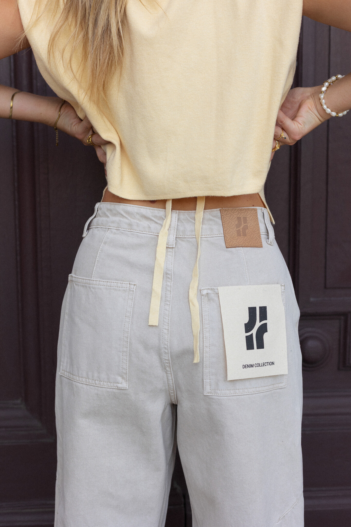 Light beige barrel jeans with a classic button closure and a mid-rise waist. The curved fit sits relaxed around the hips and tapers subtly. Pair with a fitted top and sneakers for a casual look, or style with loafers or heels for a more dressed-up feel.