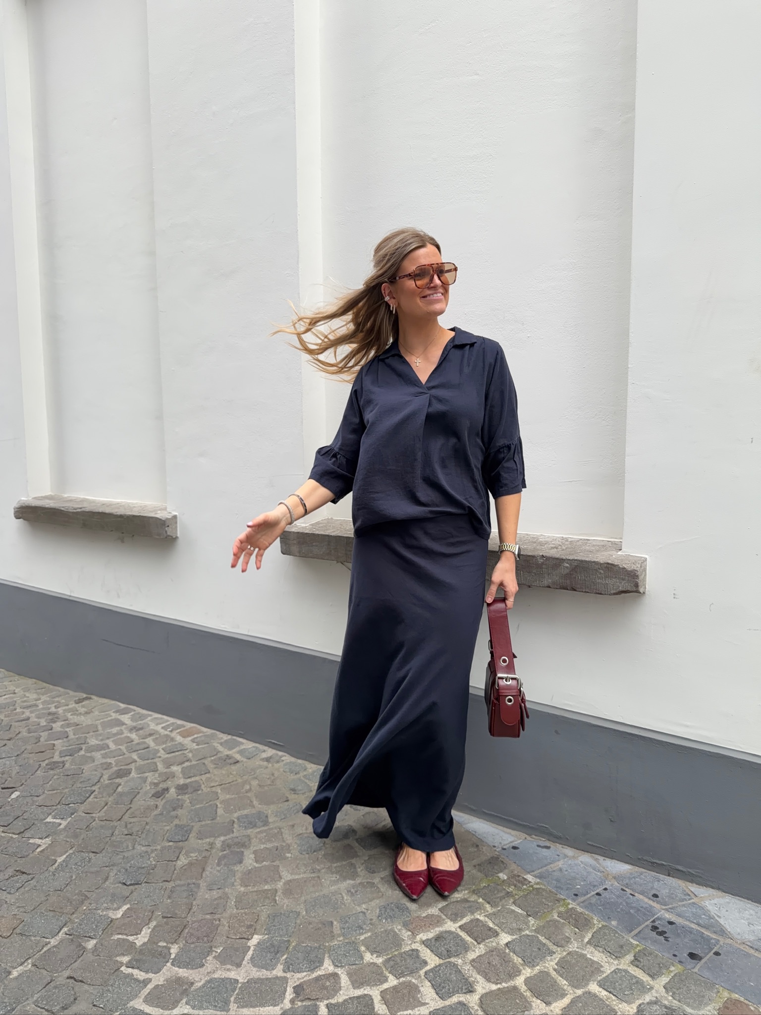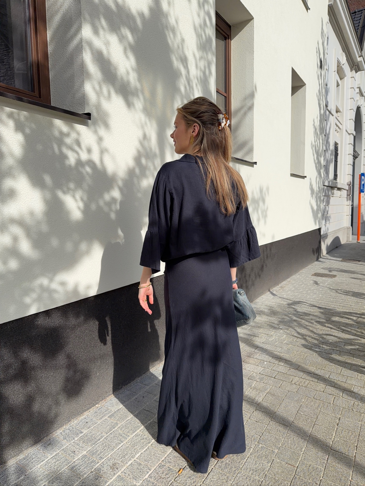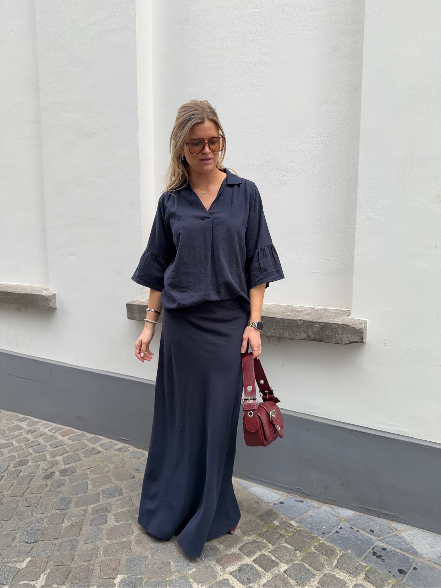 Eline is 178cm tall and is dressed in size 42/XL for an oversized look