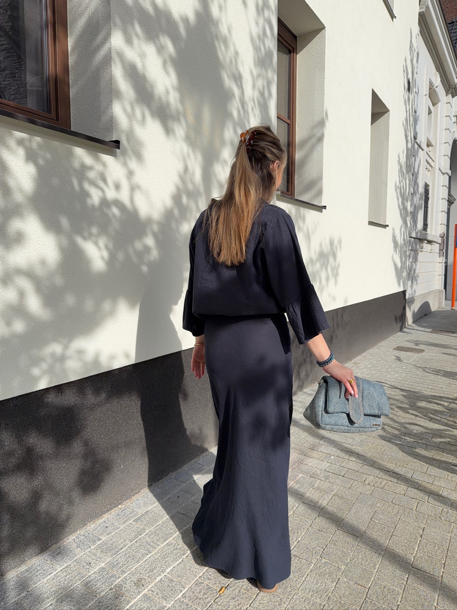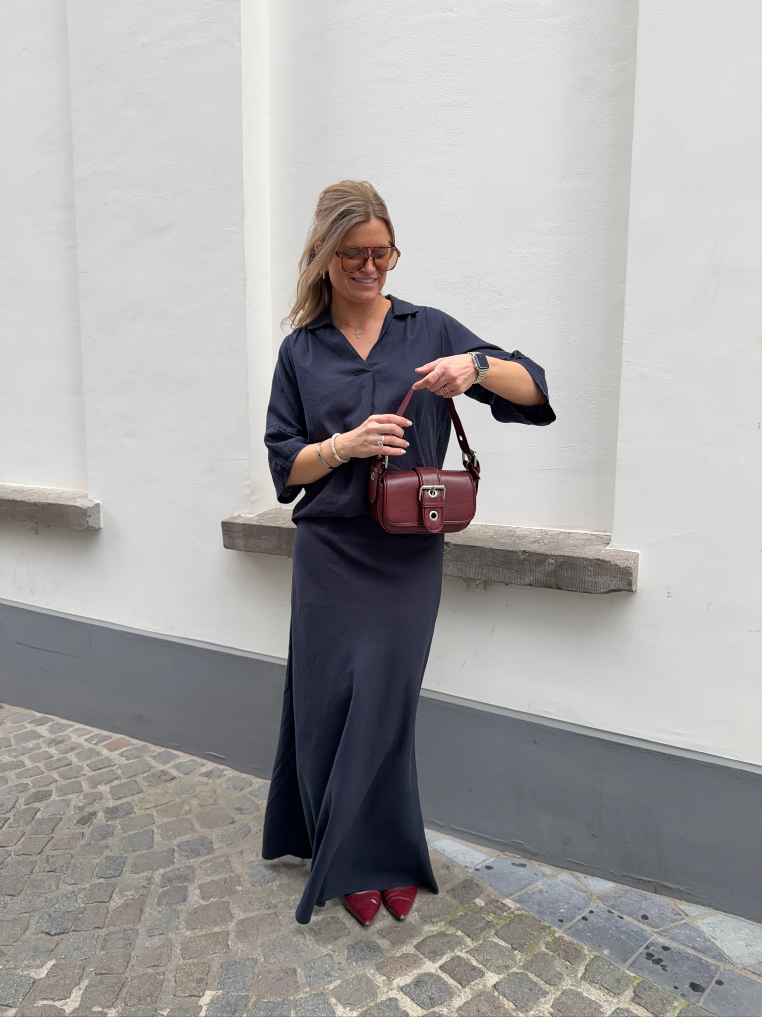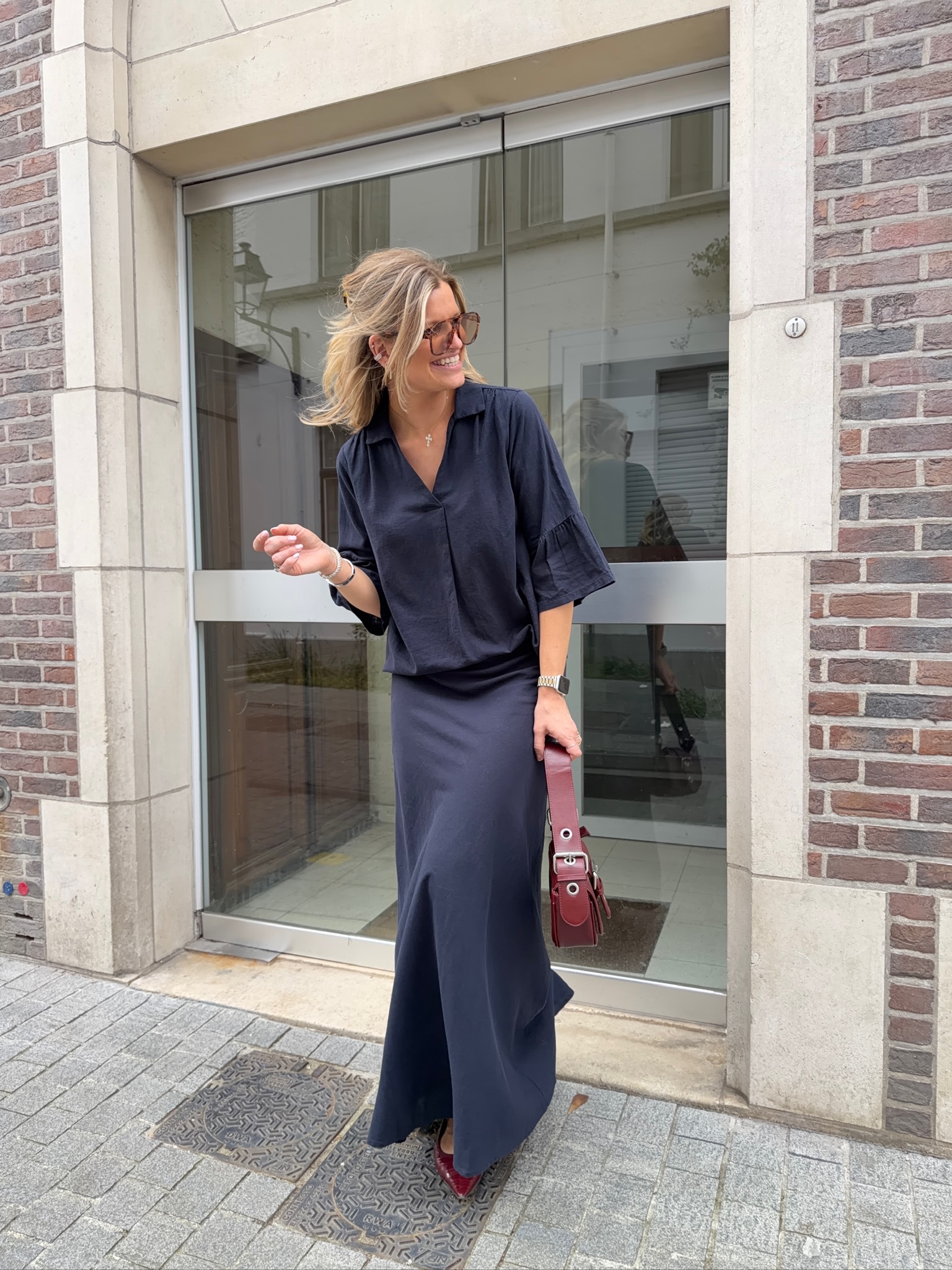 Eline is 178cm tall and is dressed in size 42/XL for an oversized look