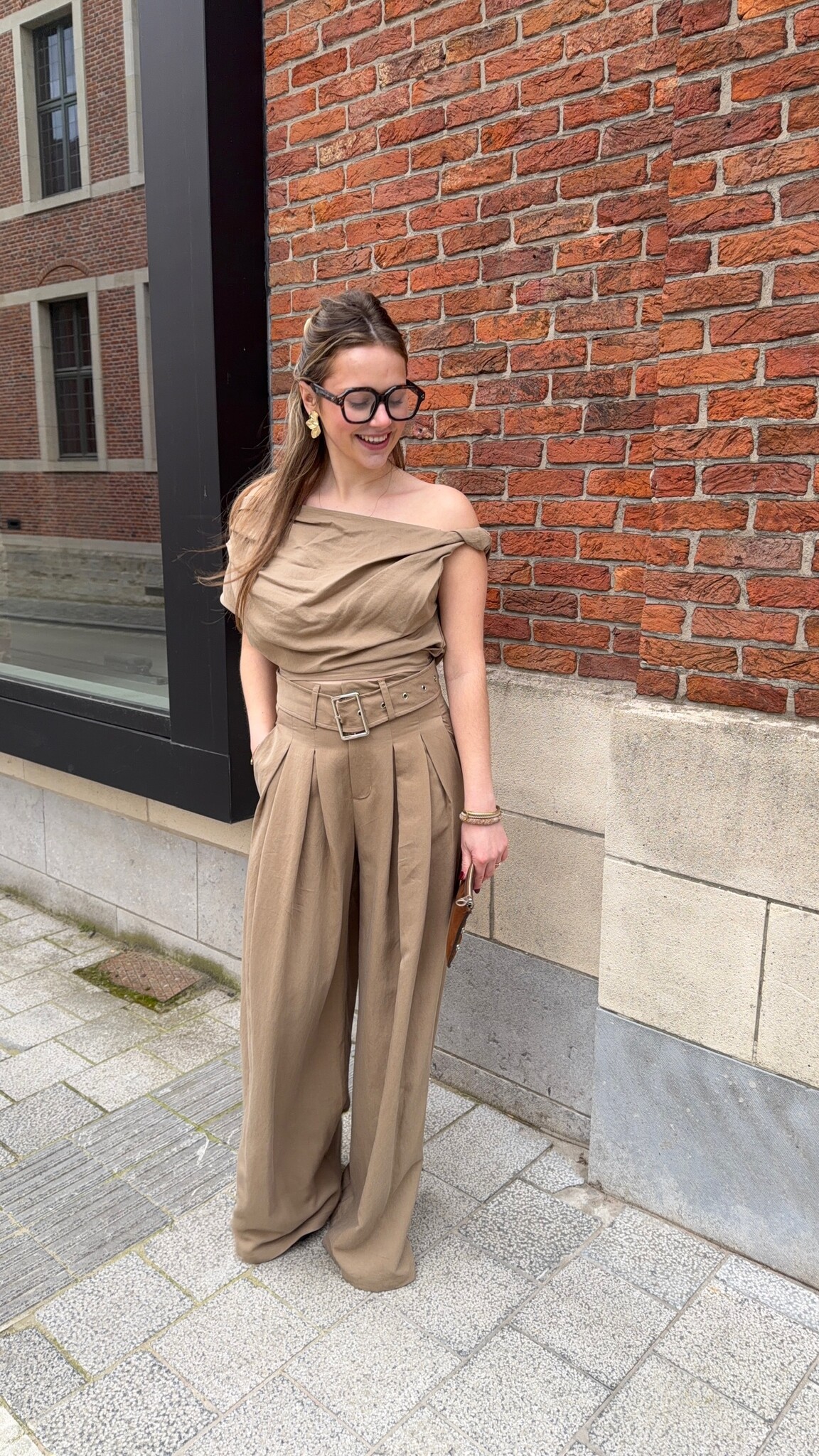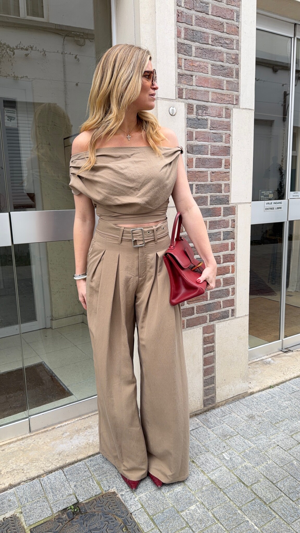 The Neva trousers is a wide-leg pant featuring a belt. The flowy fit and structured pleats create a distinctive and elegant shape. Easy to mix and match thanks to its neutral tone, or style it with the matching top to create a classy co-ord look.