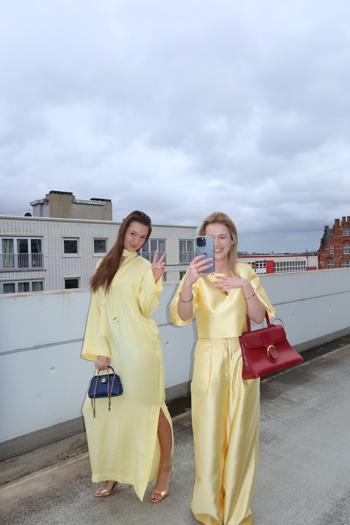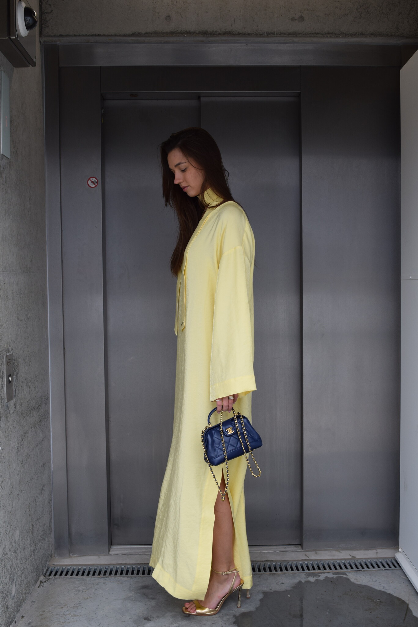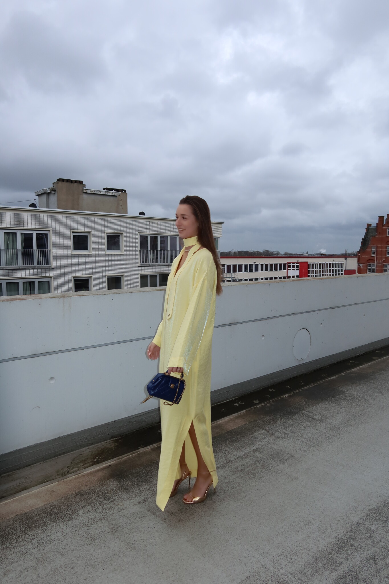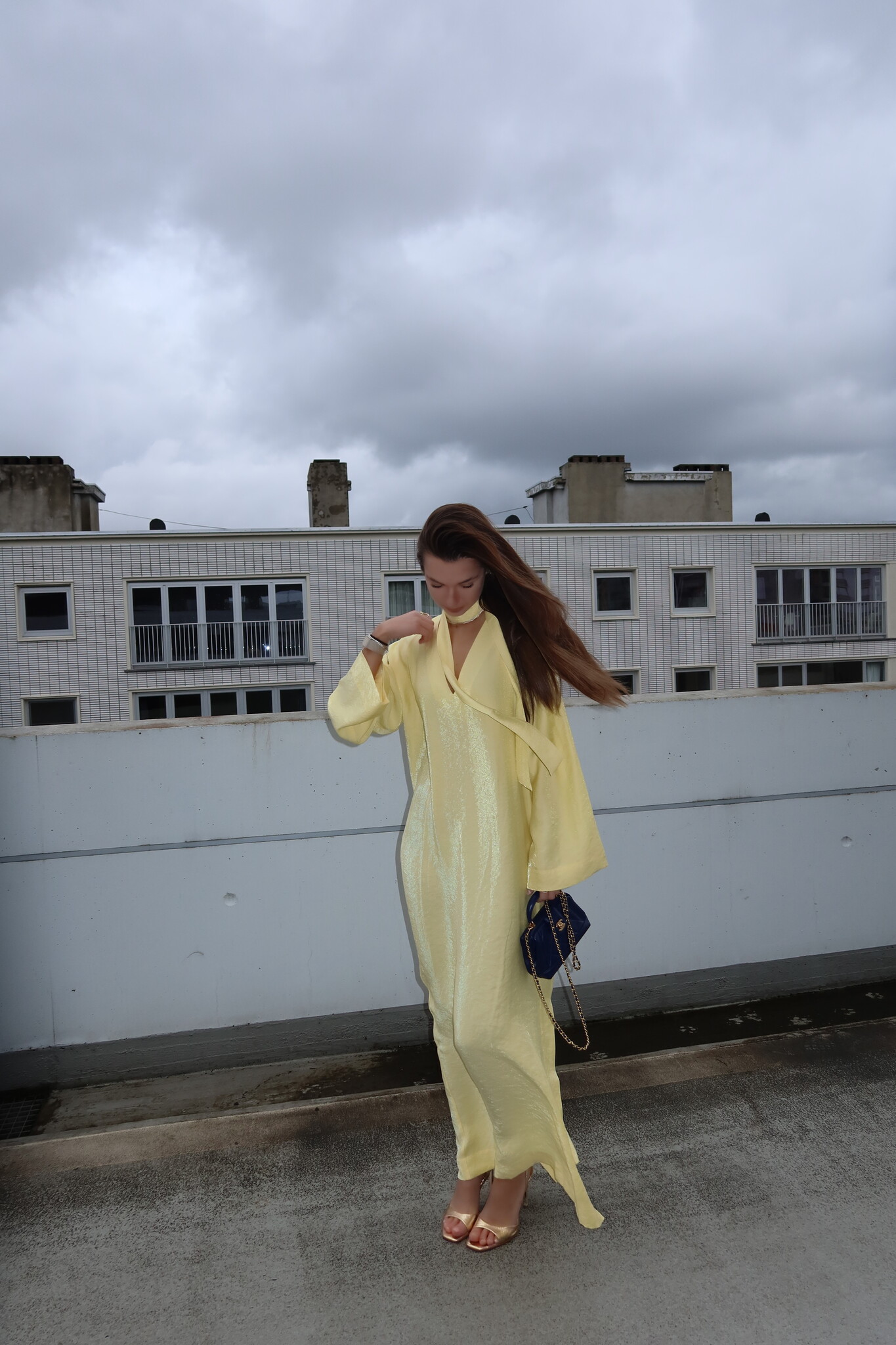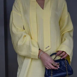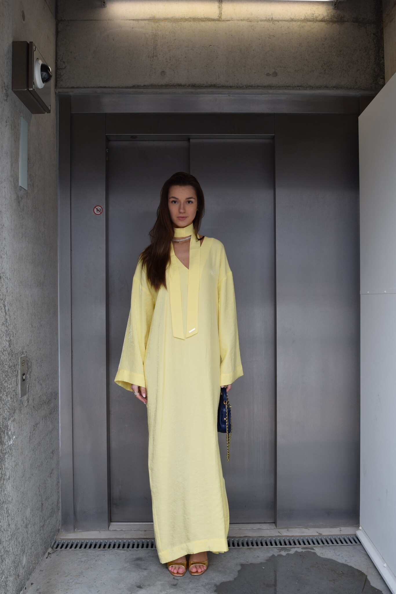 Discover the Serafina Dress Yellow, an elegant long dress with a V-neck and matching scarf that can be styled in multiple ways: around the neck, as a belt, on the arm, or as a bag accessory. Perfect for weddings or sunny days.