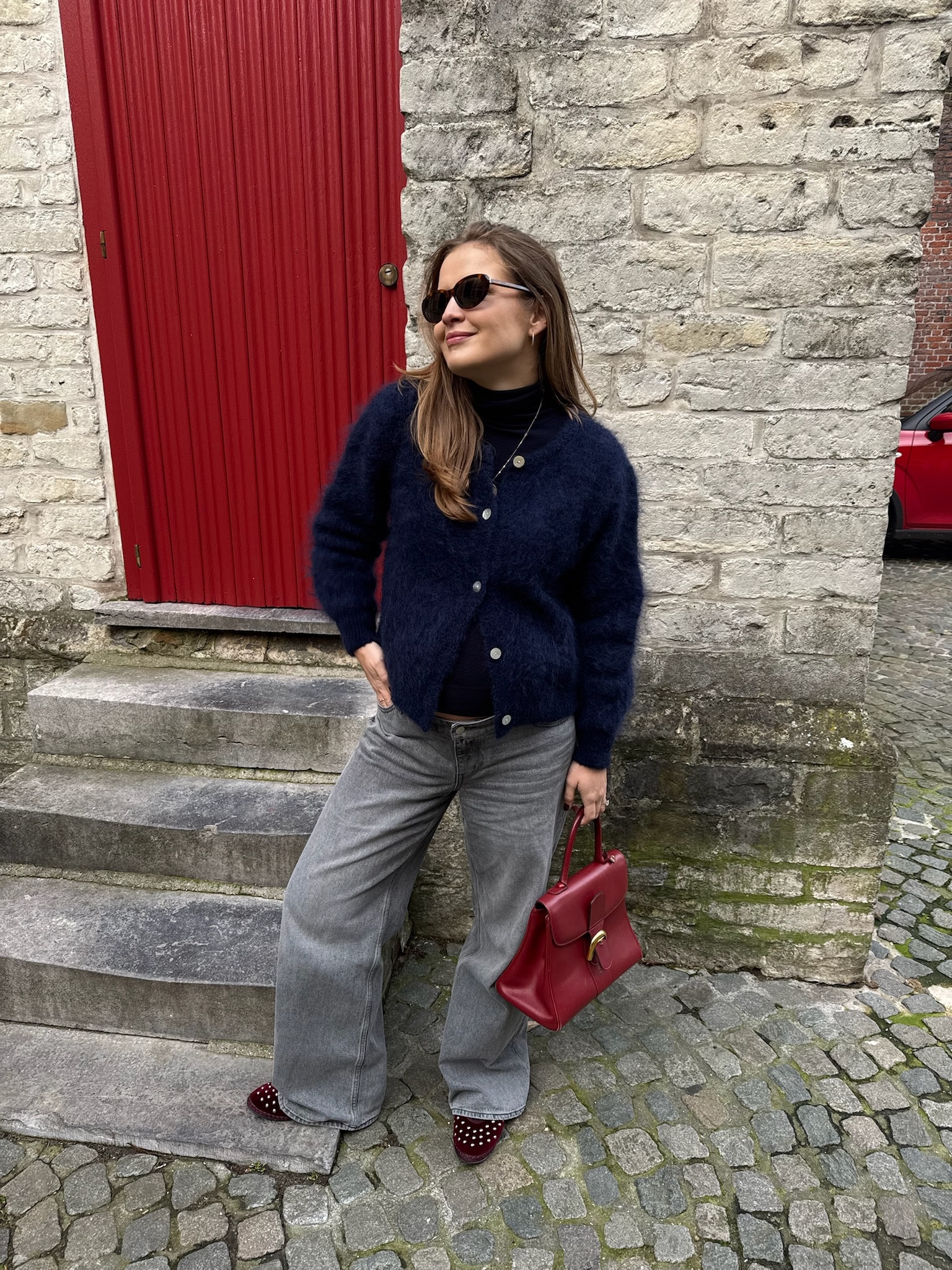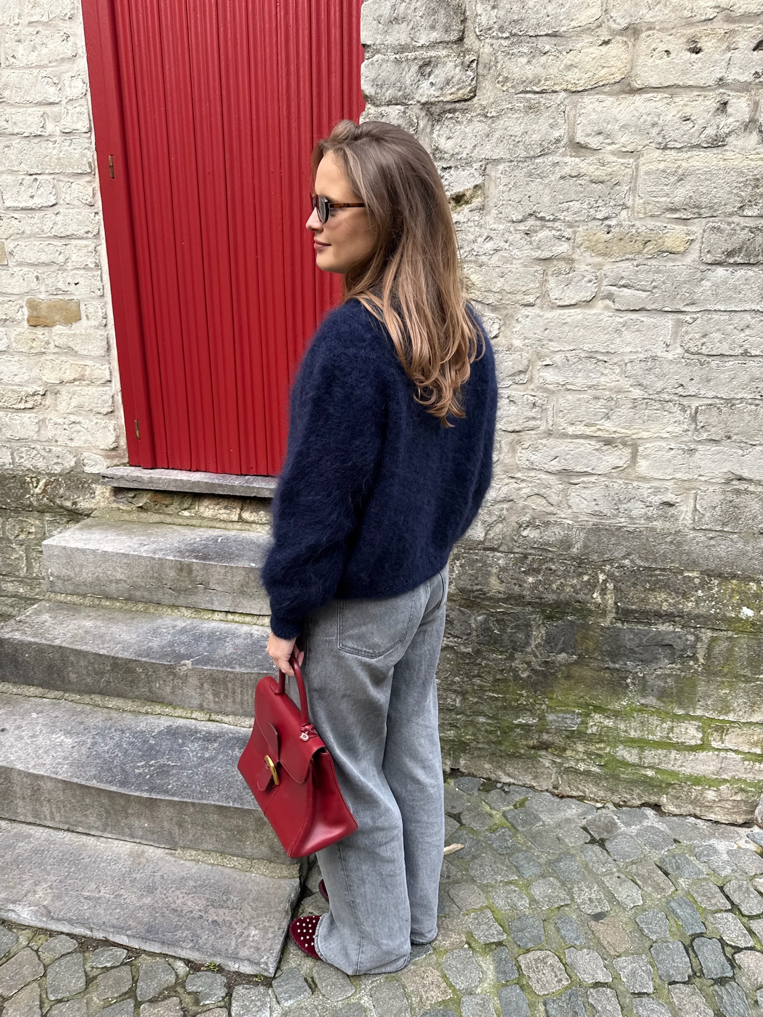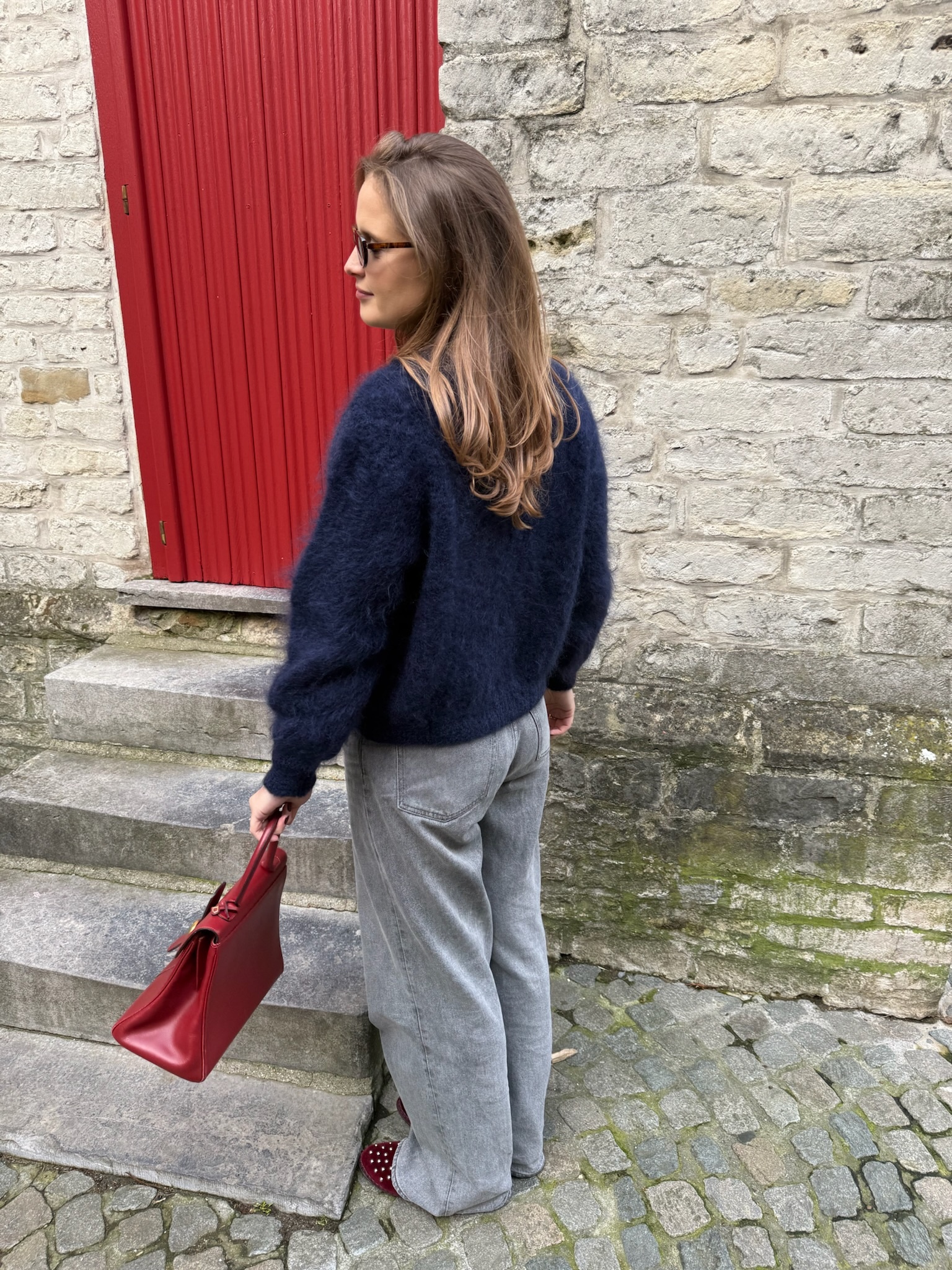 Mohair navy cardigan - een classy knit die onmiddellijk luxe uitstraalt. De zachte mohairmix voelt heerlijk aan en de navy kleur maakt het stuk tijdloos en chic.